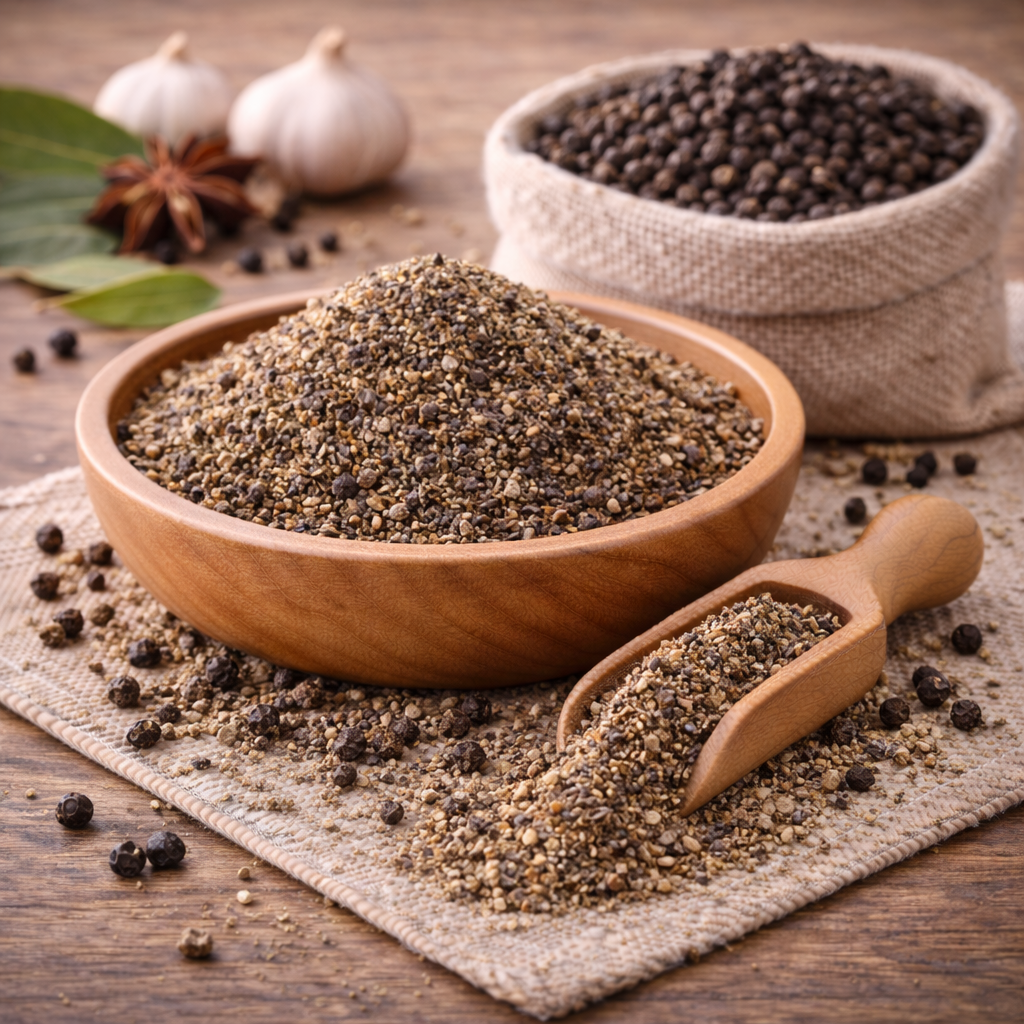 Kaali Mirch Pisi is commonly used in curries, gravies, soups, marinades, chaat, salads, and spice blends. Its fine texture ensures even mixing and balanced heat in every recipe.